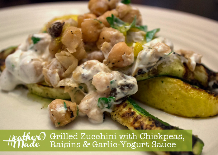This grilled squash with chickpeas, raisins and garlic-yogurt sauce hits all different bells and whistles that I think would be served somewhere exotic, like Morracco. The chickpeas have a bit of pop to them in texture and even more so with the hot and sweetly warm spices. The grilled zucchini is toothsome and even better with grill marks. To top it off there's creamy garlic-yogurt sauce. For those of you who think eating vegetarian food is for the birds, try this hearty dish and you'll be singing a different tune.